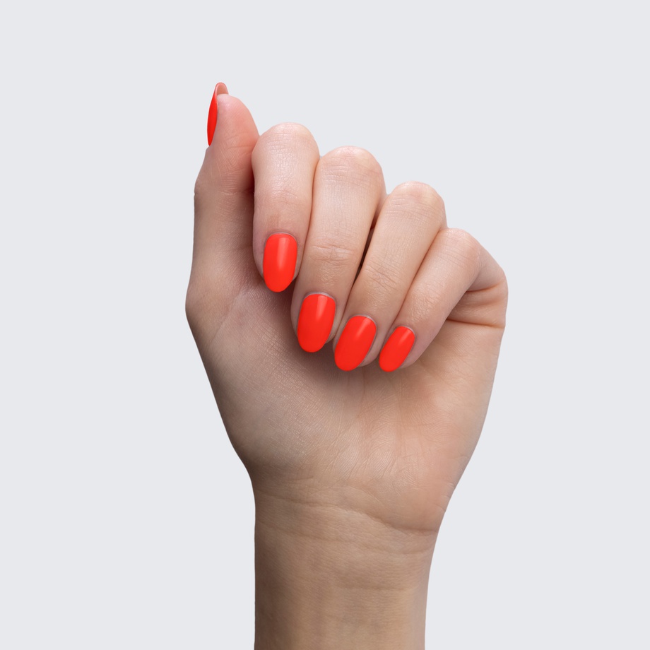 Neon orange. Bright. Cool undertone. Medium opacity / “coverage”.